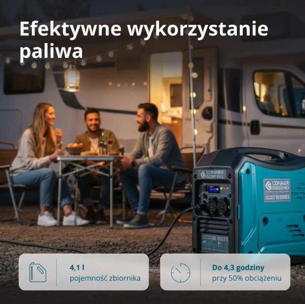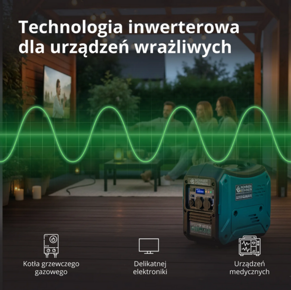 • Technologia inwerterowa – stabilne napięcie 230 V / 50 Hz z czystą sinusoidą