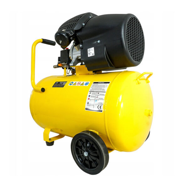 Kompresor wyposażony jest w smarowaną olejem pompę, co przekłada się na długą żywotność i bezawaryjną pracę. Dzięki dużym kołom, ergonomicznemu uchwytowi i solidnej konstrukcji, sprzęt jest łatwy w transporcie i odporny na intensywną eksploatację. Na panelu sterującym znajdują się dwa manometry – jeden do kontroli ciśnienia roboczego, drugi do zbiornika – oraz dwa szybkozłącza pneumatyczne.