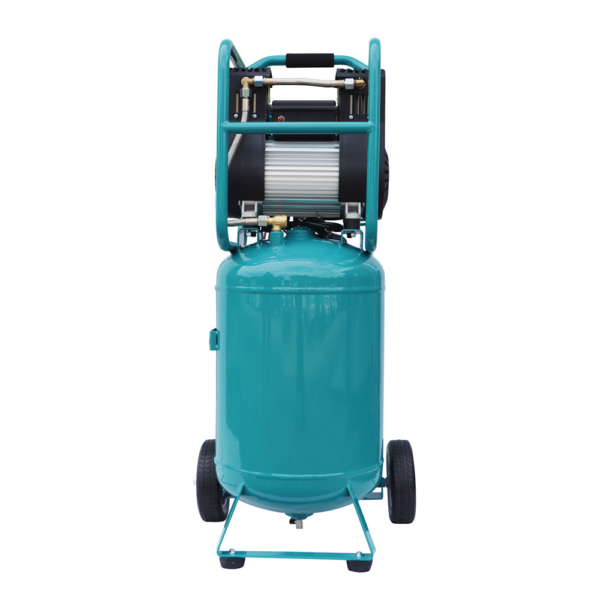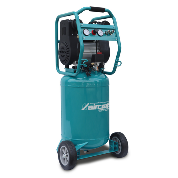 Sprężarka została wyposażona w silnik elektryczny z zabezpieczeniem termicznym, malowany proszkowo zbiornik oraz solidną, a jednocześnie poręczną konstrukcję. Gumowe nóżki antywibracyjne oraz koła z pełnymi gumowymi oponami zapewniają stabilność podczas pracy i ułatwiają transport urządzenia w obrębie warsztatu.