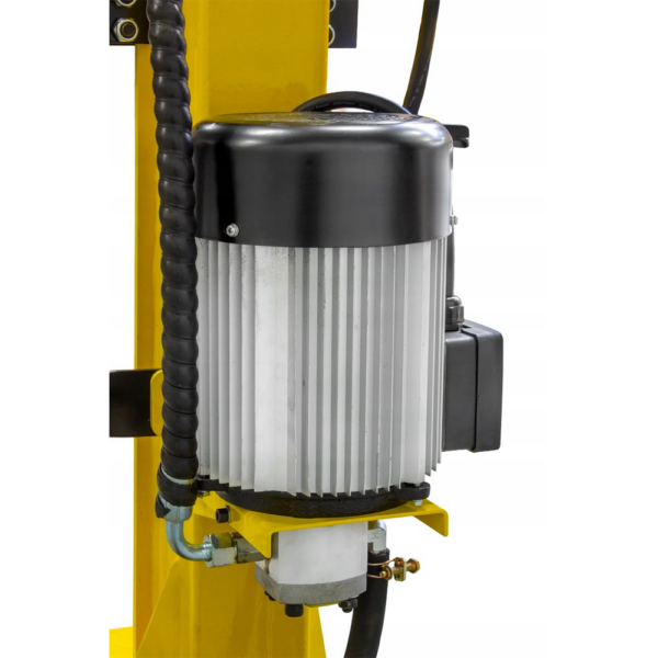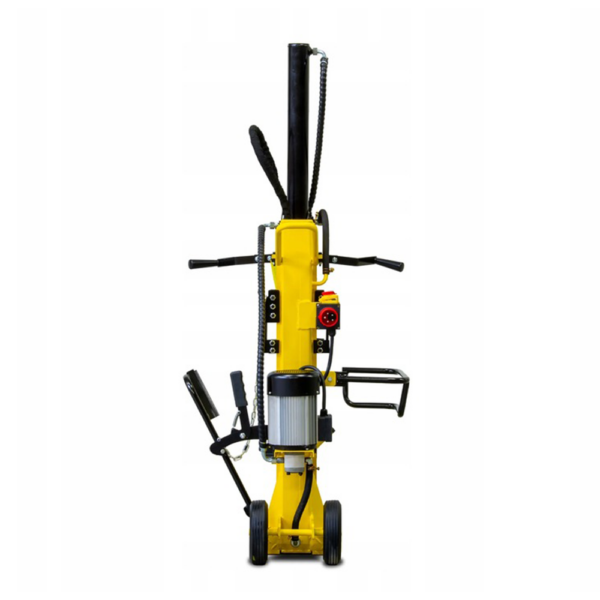 Pionowa konstrukcja zapewnia stabilną i bezpieczną pracę, a wydajny układ hydrauliczny o ciśnieniu roboczym 180 bar gwarantuje płynne i skuteczne rozłupywanie. Łuparka została wyposażona w dwuręczny system sterowania, który znacząco podnosi bezpieczeństwo operatora, oraz podnośnik kłód z hakiem i łańcuchem, ułatwiający obsługę ciężkiego materiału.