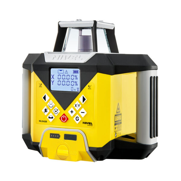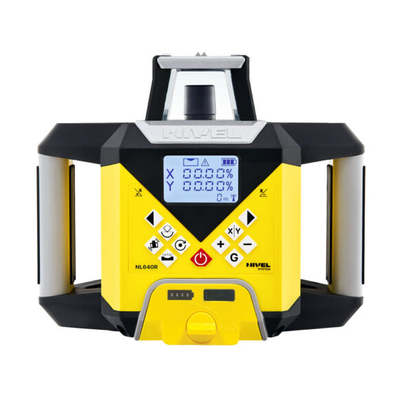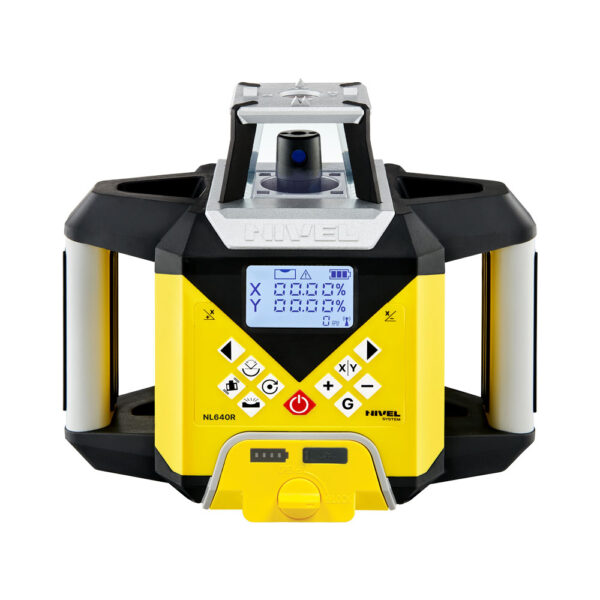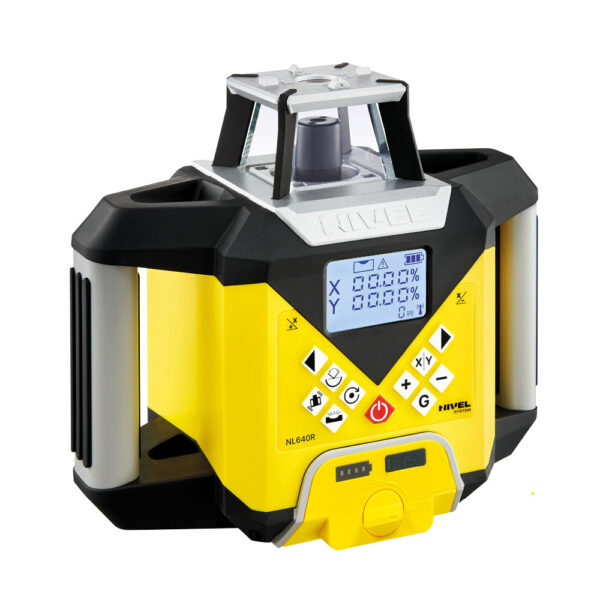 Niwelator NL640R DIGITAL posiada czytelny i prosty w obsłudze panel sterowania. Wprowadzanie spadków odbywa się cyfrowo, a wszystkimi funkcjami można sterować zarówno z poziomu instrumentu, jak i za pomocą pilota radiowego (zasięg do 100 m). Urządzenie zasilane jest wydajnym akumulatorem Li-ion 8000 mAh, który zapewnia długą pracę i możliwość ładowania w trakcie użytkowania. Kompaktowa obudowa z praktycznymi uchwytami sprawia, że laser jest wygodny w transporcie i szybki w instalacji na placu budowy.
