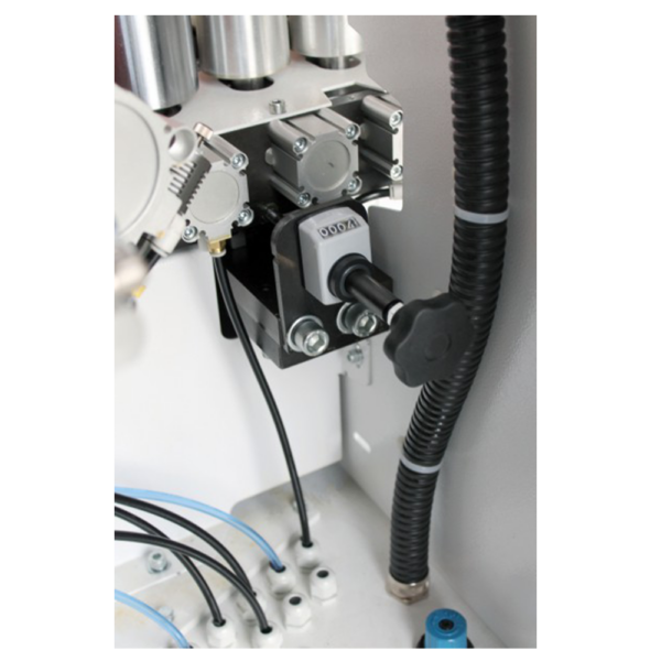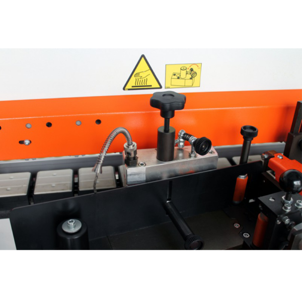Maszyna posiada nakładanie kleju wałkiem w tym samym kierunku co posuw obrabianego elementu, bez konieczności regulacji grubości materiału. Zbiornik kleju pokryty teflonem oraz elektroniczna regulacja temperatury kleju (190°C) gwarantują stabilną i czystą pracę. Po zakończeniu oklejania temperatura kleju jest automatycznie obniżana, co ogranicza jego zużycie.