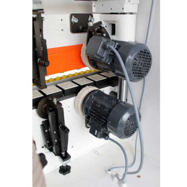 - Agregat górnego i dolnego frezowania z pionową i poziomą regulacją na dwóch silnikach (mocowane na łożyskach liniowych) HF 200 Hz, 12000 obr./min. i głowicami frezującymi 75, Z=4; 15, R2 lub R3 mm (opcjonalnie).