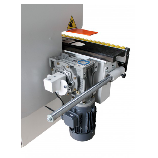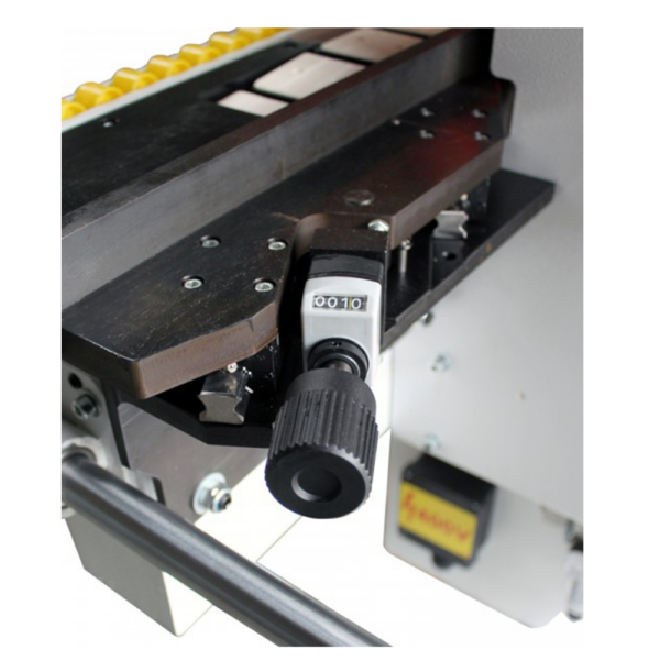 System docisku oparty jest na rolkach na łożyskach z dużą siłą nacisku, a posuw realizowany jest przez łańcuch, co zapewnia stabilność i powtarzalność procesu. Maszyna posiada wysuwany wspornik z rolkami do 650 mm oraz centralny, ręcznie regulowany docisk górny.