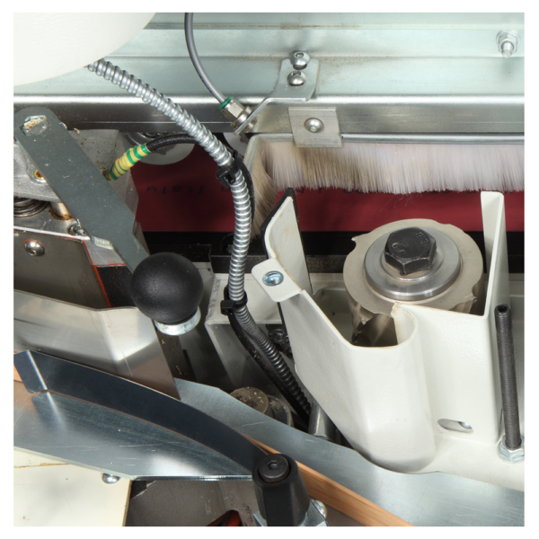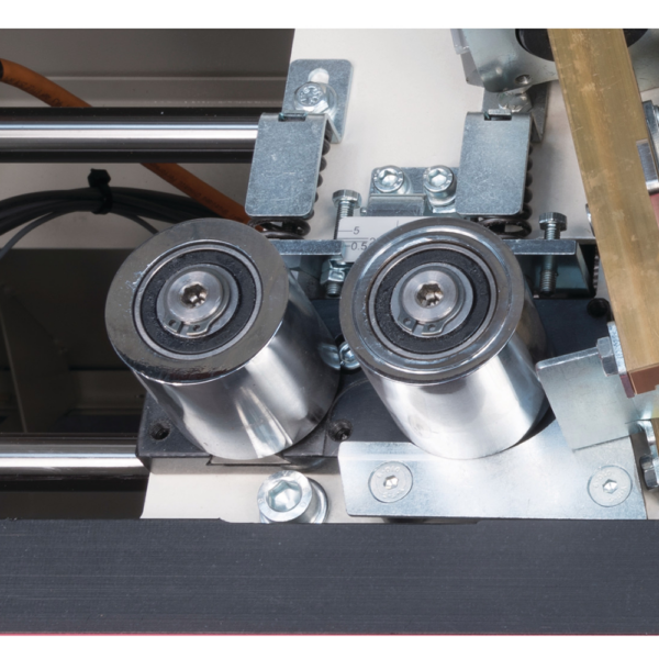 - Precyzyjny posuw – taśma dolna + podwójne gumowe rolki dociskowe (brak zadrapań)