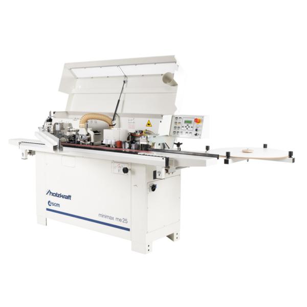 Okleiniarka prostoliniowa HOLZKRAFT Minimax ME 25 S – posuw 7 m/min, agregat cykliny promieniowej R=2 mm z łamaczami wióra, polerka 2 × 0,14 kW, agregat frezujący HM, gilotyna 90°, zbiornik kleju ~1 kg z regulacją 190–220°C i panel PLC. Grubość obrzeży 0,4–3 mm (rolka) / do 5 mm (doklejka), elementy 16–50 mm. Stół 2600 × 530 mm, waga 450 kg – do wysokiej jakości oklejania krawędzi mebli.