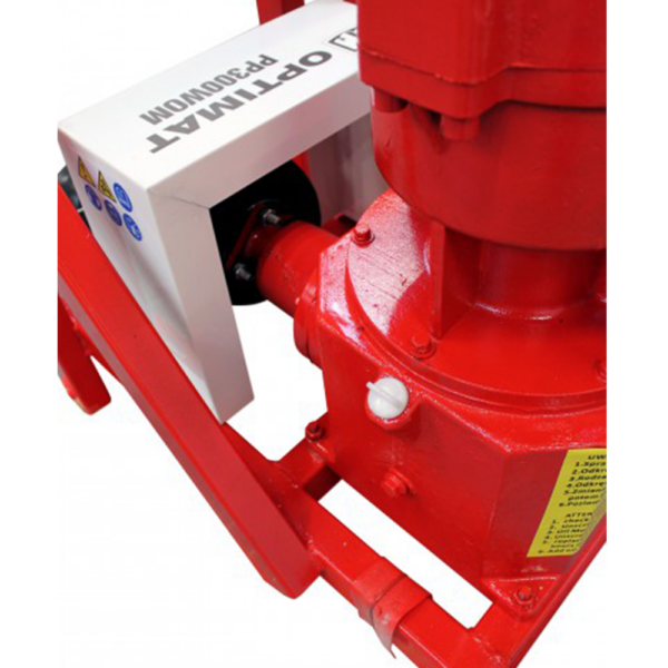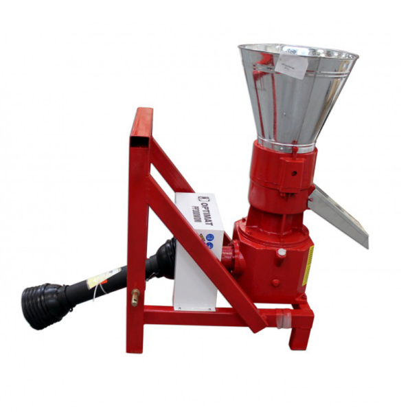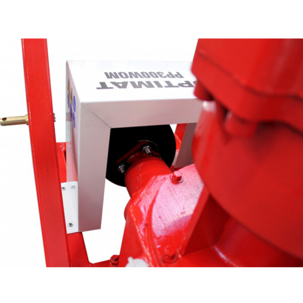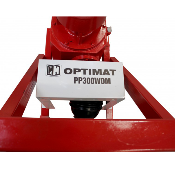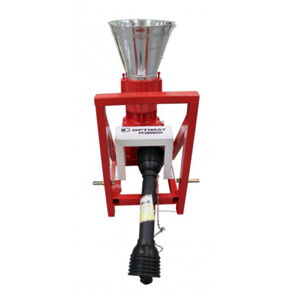 Peleciarka Optimat PP300WOM do ciągnika – wydajność do 300 kg/h paszy i 140 kg/h trocin. Matryca Ø199 mm, wał Tersa, zasilanie WOM 10–18 KM. Solidna peleciarka przemysłowa z żeliwa i stali – idealna do produkcji pelletu i paszy.