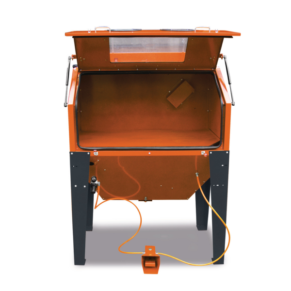 Obwodowe uszczelki, stabilna kratka nośna (do 120 kg), otwór spustowy i rura ssąca na dnie gwarantują efektywną recyrkulację ścierniwa i łatwą konserwację. Obsługuje szeroki zakres materiałów (korund, kulki szklane, kwarc, plastik, węglik krzemu) – idealna do intensywnego usuwania rdzy, farby, lakieru, matowienia felg, przygotowania powierzchni pod lakierowanie/proszkowanie oraz renowacji dużych części.