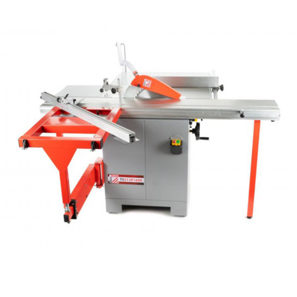 Pilarka formatowa Holzmann TS315F1600 – płynny aluminiowy wózek przesuwny 1600 mm z rolką nośną, tarcza Ø315 mm (cięcie do 100 mm przy 90° / 70 mm przy 45°), żeliwny stół, przedłużenie i poszerzenie stołu, precyzyjny ogranicznik równoległy i poprzeczny, docisk i popychacze. Moc S1 2800 W / S6 3920 W, obroty 4000 obr/min, króciec odciągowy 100 mm, waga brutto 187 kg – do cięcia płyt, mebli i elementów stolarskich.