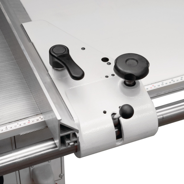 W standardowym wyposażeniu znajduje się liniał do cięcia poprzecznego z regulacją kąta, teleskopowym przedłużeniem oraz dwoma ogranicznikami, prowadnica wzdłużna z blokadą i regulacją kąta, a także docisk mimośrodowy i poszerzenie stołu. Duże poszerzenie wózka na przestawnym ramieniu zwiększa komfort pracy przy dużych formatach.