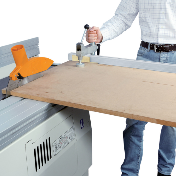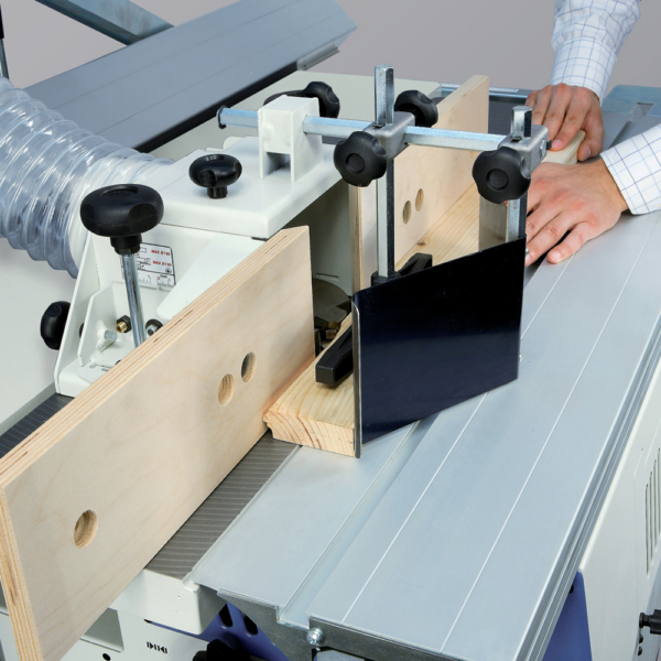 Pilarko-frezarka kombinowana HOLZKRAFT / SCM ST 1 genius – stabilna żeliwno-stalowa konstrukcja, wózek formatówki anodowany 1200 mm, piła Ø250 mm (wysokość cięcia 80 mm przy 90°), pochylenie 45°, frezarka dolnowrzecionowa Ø30 mm z 2 prędkościami 5000/7500 obr/min. 2 silniki po 1,8 kW, docisk mimośrodowy, osłona do frezowania krzywoliniowego, króciec odciągowy 120 mm. Waga 190 kg – do cięcia i profilowania krawędzi w stolarstwie i warsztatach meblarskich.
