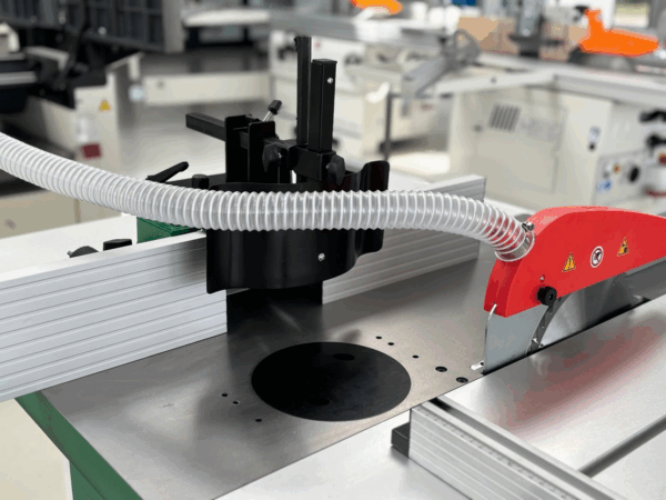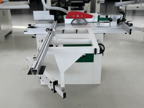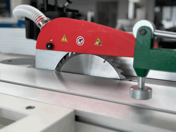 Pochylany agregat piły, precyzyjny wózek formatowy z anodowanego aluminium, rozbudowane systemy prowadnic i docisków zapewniają maksymalną kontrolę i bezpieczeństwo podczas pracy.