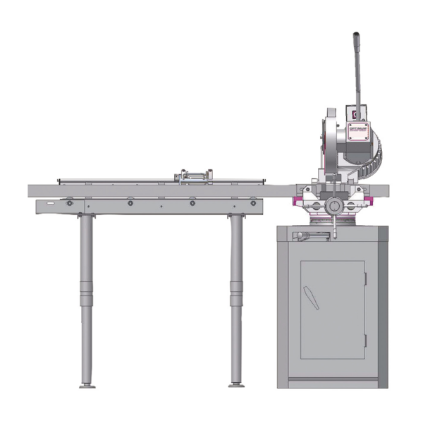 O bezpieczeństwo operatora dba zamknięta, ruchoma osłona, funkcjonalne zabezpieczenie podczas piłowania oraz mechanizm szybkiego otwierania, zapewniający wygodny i bezpieczny dostęp do strefy roboczej. Masywna podstawa maszyny z otworami montażowymi umożliwia stabilne ustawienie oraz współpracę ze stojakiem materiałowym MSR.
