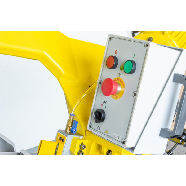 Maszyna wyposażona jest w skrętne ramię umożliwiające cięcie pod kątem od 0° do 60°, co znacząco zwiększa jej uniwersalność. Prowadnice taśmy z łożyskami oraz węglikami spiekanymi zapewniają stabilne prowadzenie brzeszczotu, ograniczenie drgań oraz wysoką jakość powierzchni cięcia.