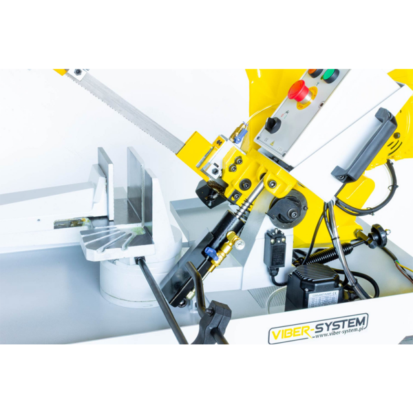 Hydrauliczny siłownik trzeciej generacji odpowiada za płynne opuszczanie ramienia, a regulowany bezstopniowo posuw pozwala precyzyjnie dopasować parametry pracy do rodzaju obrabianego materiału. Wydajny system chłodzenia z pompą chroni taśmę tnącą i zwiększa jej żywotność.