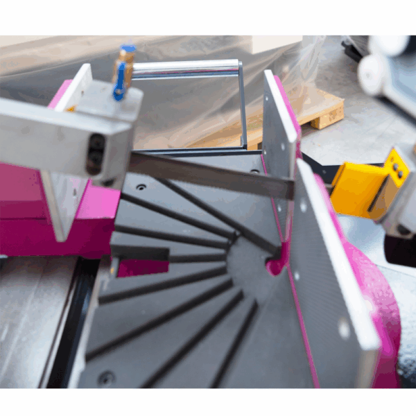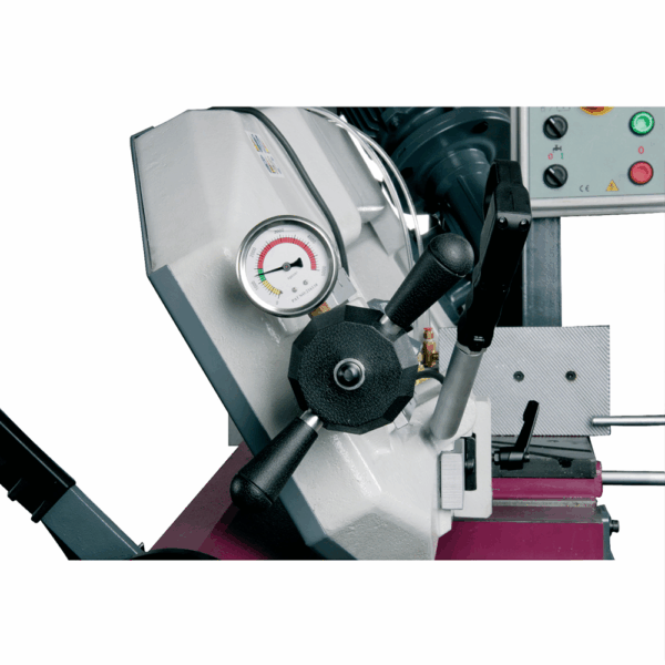 Maszyna posiada pompę chłodziwa, która skutecznie chłodzi i smaruje taśmę podczas pracy, przedłużając jej żywotność i zapewniając czyste krawędzie cięcia. Wygodne imadło szybkomocujące umożliwia błyskawiczne mocowanie materiału, a zawór regulacyjny w pulpicie sterowania pozwala łatwo ustawić prędkość opuszczania ramienia.