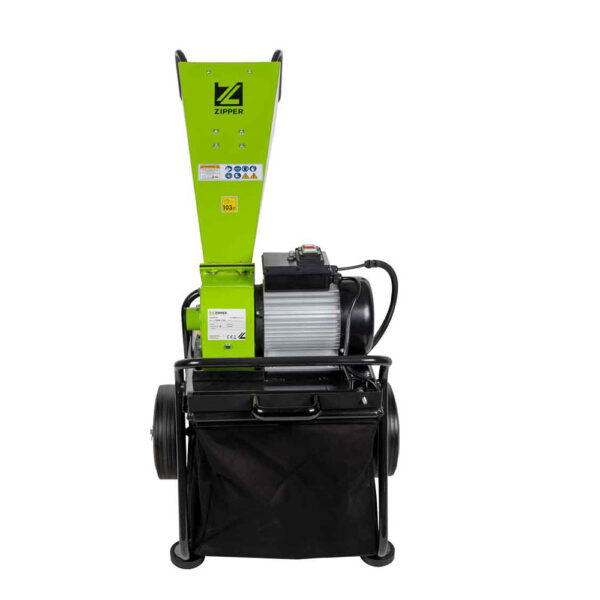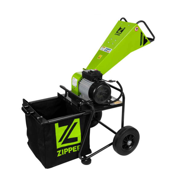 Elektryczny rozdrabniacz do gałęzi Zipper ZI-HAEK2800-230 o mocy 2,8 kW, z workiem 65 l i średnicą cięcia do 50 mm. Idealny do ogrodu i działki.