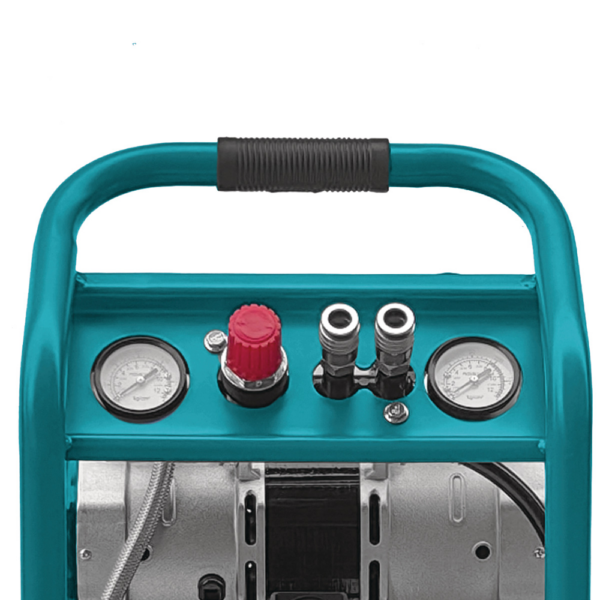 Model wyposażono w mocny silnik elektryczny z automatycznym wyłącznikiem, reduktor ciśnienia z płynną regulacją oraz dwa szybkozłącza umożliwiające jednoczesną pracę z dwoma narzędziami. Cicha praca na poziomie 64 dB(A) znacząco podnosi komfort codziennego użytkowania.