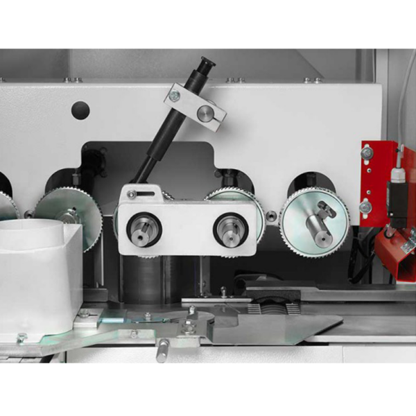 - Pneumatyczny docisk rolek + wałek wstępny – perfekcyjne trzymanie nawet lekko zakrzywionego surowca. Automatyczne wyłączanie wałka wstępnego przy cienkich listwach – mniej uszkodzeń.