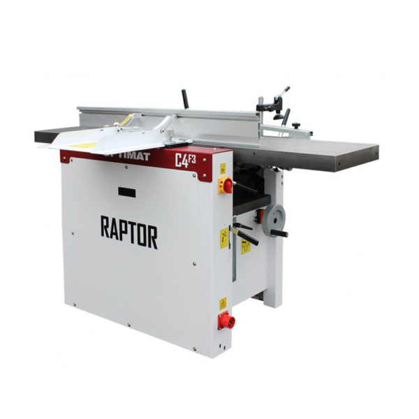 Strugarko-grubościówka OPTIMAT RAPTOR C4-F3 z wałem nożowym i wiertarką: stół strugarki 400×1800 mm, grubościówki 400×760 mm, wiertarka 250×500 mm, moc 4 kW, waga 385 kg. Kompaktowa do małych warsztatów – precyzyjna obróbka drewna.