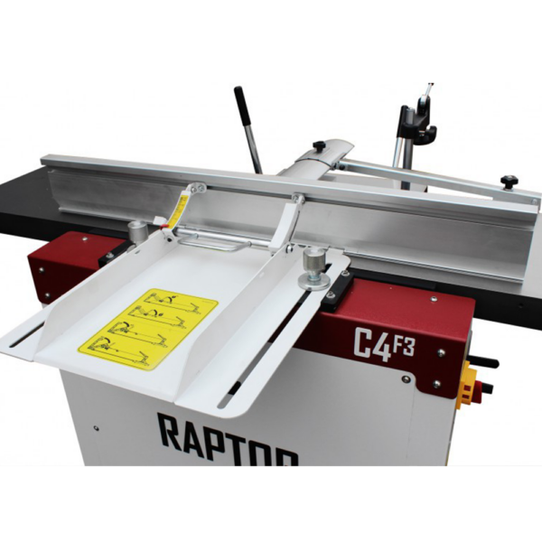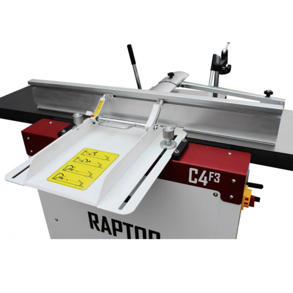 OPTIMAT RAPTOR C4-F3 to profesjonalna strugarko-grubościówka z wałem nożowym i wiertarką, łącząca cechy przemysłowej obrabiarki z gabarytami dla małych warsztatów. Wał nożowy z 3 nożami zapewnia wydajną obróbkę bez drgań. Strugarka: stół 400×1800 mm, wał Ø70 mm, regulacja stołu do 4 mm. Grubościówka: stół 400×760 mm, posuw 7 m/min, wysokość robocza 4-220 mm. Wiertarka: stół 250×500 mm, skok 205/95/90 mm, wrzeciono M18*1.5-S 0-16 mm. Moc silnika 4 kW trójfazowy, waga 385 kg – żeliwna konstrukcja dla stabilności. Idealna do wyrównywania desek, produkcji mebli i renowacji. Jakość OPTIMAT w cenie dla hobbystów i profesjonalistów.