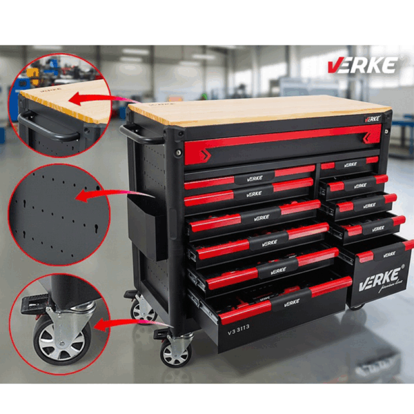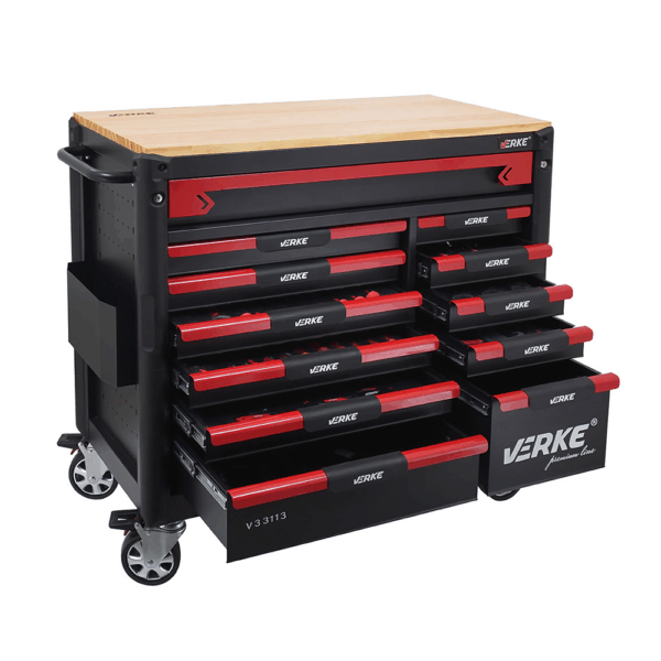 Profesjonalna szafka narzędziowa Verke Premium Line V33113 posiada 12 szuflad na prowadnicach kulkowych, blat roboczy z litego dębu o udźwigu 600 kg oraz 293 elementy narzędzi CR-V. Wyposażona w podwójny zamek, magnetyczne blokady, koła skrętne z hamulcem i półkę boczną. Idealna do warsztatów, serwisów i garaży.