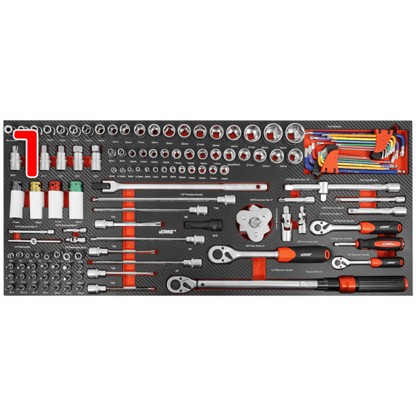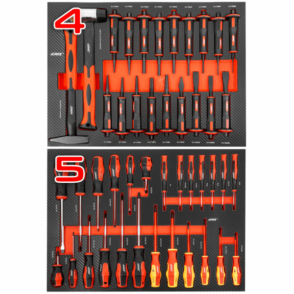 W zestawie znajduje się 293 profesjonalnych narzędzi wykonanych z wytrzymałej stali Chrome Vanadium CR-V, m.in. nasadki, klucze, wkrętaki, szczypce, młotki oraz precyzyjne narzędzia pomiarowe. To kompletny zestaw dla warsztatów samochodowych, serwisów technicznych, zakładów przemysłowych oraz zaawansowanych majsterkowiczów.