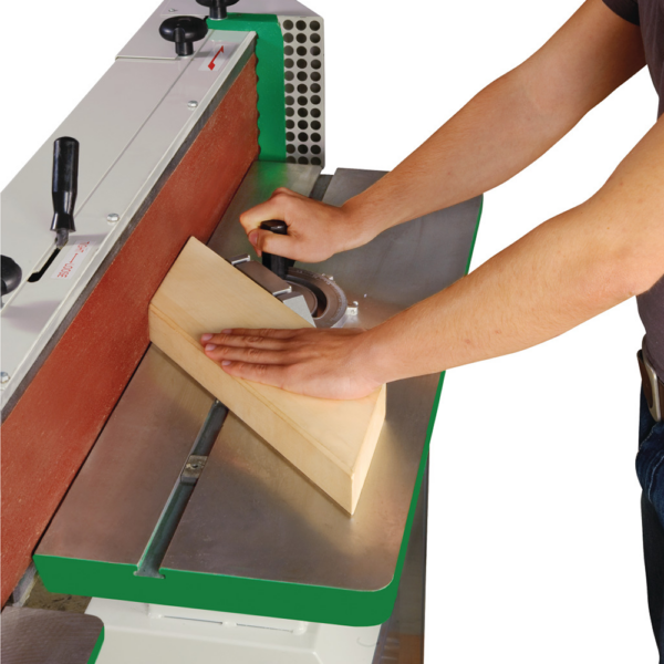 Maszyna wyposażona jest w żeliwny stół roboczy z rowkiem teowym, który gwarantuje wysoką stabilność oraz dokładne prowadzenie materiału. Bezstopniowa regulacja wysokości stołu umożliwia dopasowanie stanowiska pracy do operatora, a przechylny agregat szlifierski w zakresie 0–90° pozwala na obróbkę pod różnymi kątami.