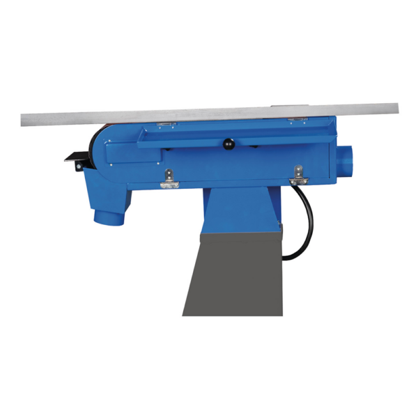 Urządzenie może pracować z systemem odciągowym lub bez niego. Dwie dysze odsysające – na skrzynce iskrowej i tylnej rolce taśmy – umożliwiają skuteczne ograniczenie pyłu i iskier. Składana tarcza ochronna zwiększa bezpieczeństwo operatora.