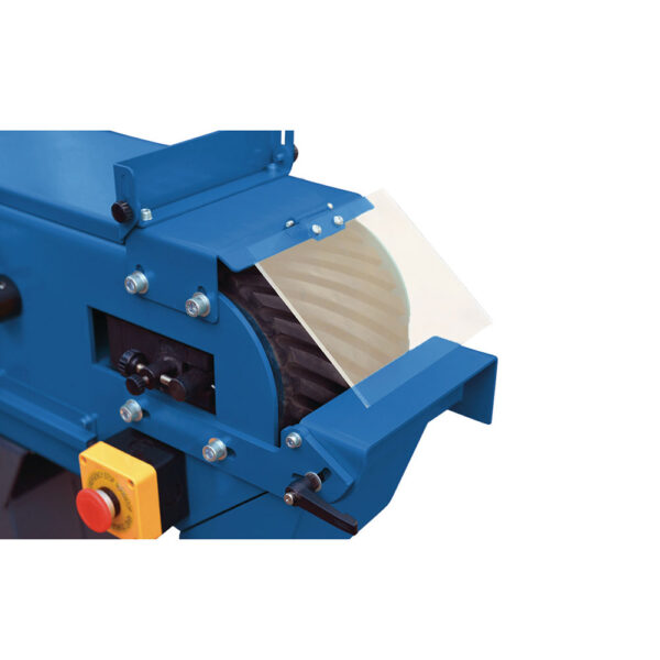Dzięki dwuprędkościowej pracy urządzenie sprawdza się zarówno przy obróbce zwykłej stali, jak i stali nierdzewnej. Zdejmowana górna osłona umożliwia szlifowanie większych elementów na pełnej powierzchni taśmy. Dodatkowo, w przedniej części maszyny znajduje się króciec odciągowy, umożliwiający pracę z systemem odpylającym lub bez niego.