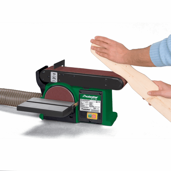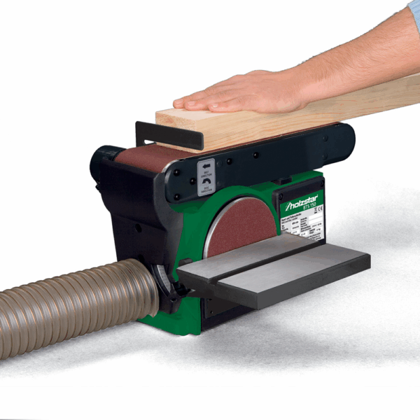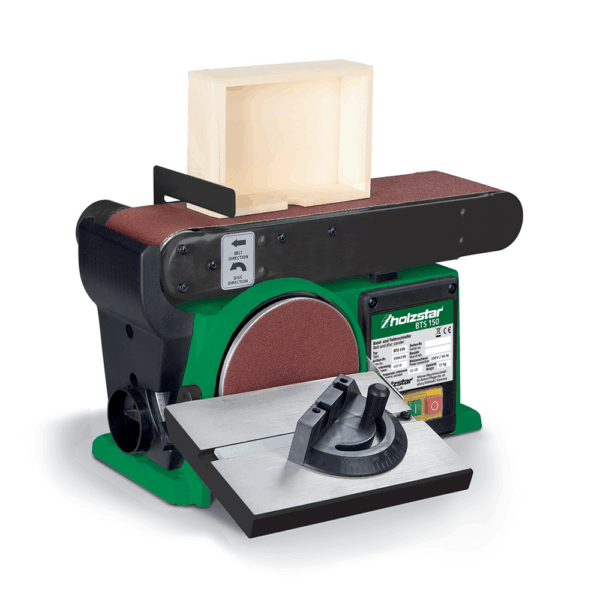 HOLZSTAR BTS 150 – kompaktowa szlifierka taśmowo-talerzowa 230V. Regulacja 0–90°, stół 0–45°, szybka wymiana taśmy i odciąg pyłu. Idealna do drewna i metalu.