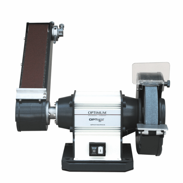 Optimum OPTIgrind GU20S to uniwersalna szlifierka stołowa z tarczą 200 mm i taśmą, napędzana mocnym silnikiem 600 W, wyposażona w bezobsługowy mechanizm i trwałą aluminiową obudowę — idealna do różnorodnych zadań szlifierskich.