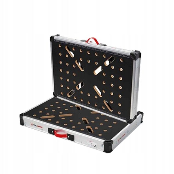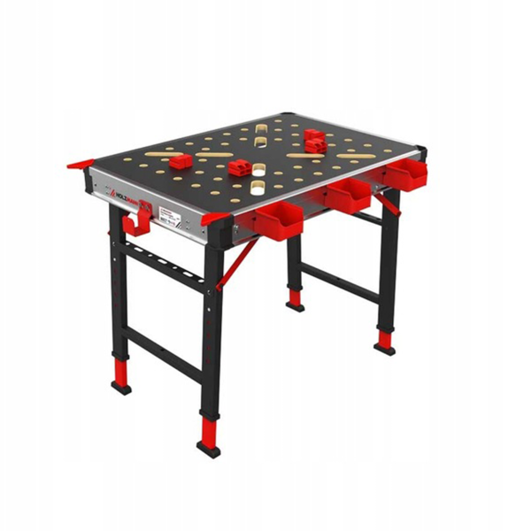 Dzięki składanej konstrukcji stół zajmuje bardzo mało miejsca po złożeniu, co czyni go idealnym rozwiązaniem do niewielkich przestrzeni warsztatowych. Dodatkowym atutem są praktyczne pojemniki warsztatowe oraz uchwyt do wygodnego przenoszenia.