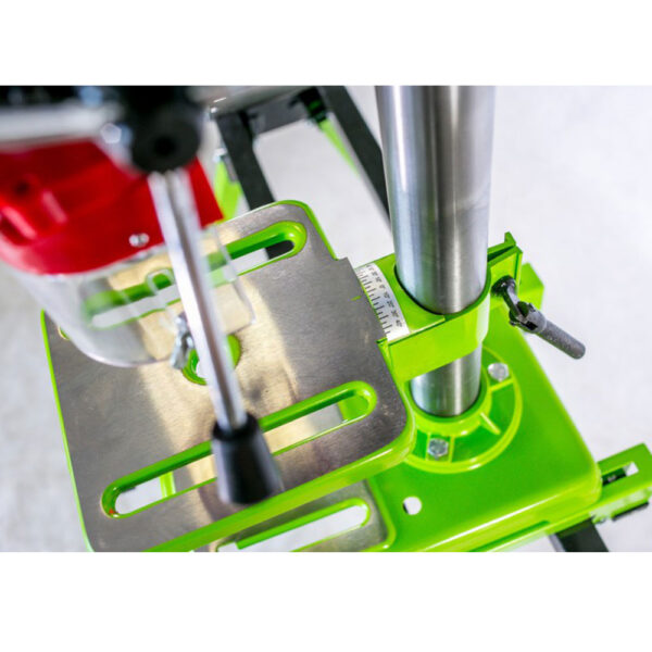 Wiertarka wyposażona jest w praktyczną trójramienną dźwignię ze skalą głębokości wiercenia, co pozwala na precyzyjne ustawienie i kontrolę wierceń. Dzięki ogranicznikowi głębokości możliwe jest wykonywanie powtarzalnych otworów o tej samej głębokości. Dodatkowo regulacja wysokości podstawy zapewnia wygodę i elastyczność podczas pracy z różnymi materiałami i elementami.
