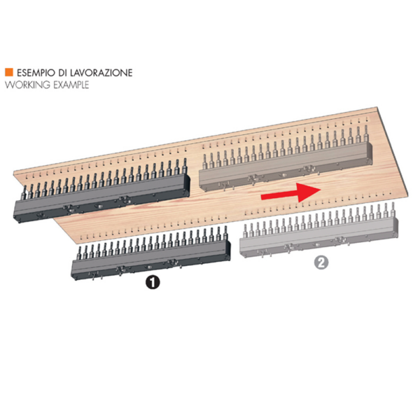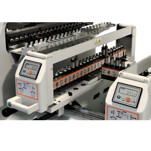 Półautomatyczna wiertarka wielowrzecionowa z 3 głowicami (2 pionowe + 1 pozioma) po 23 wrzeciona każda. Idealna do szybkiej produkcji regałów, szaf i mebli wielkogabarytowych. Znacznie przyspiesza pracę w porównaniu do wiertarek jednogłowicowych.