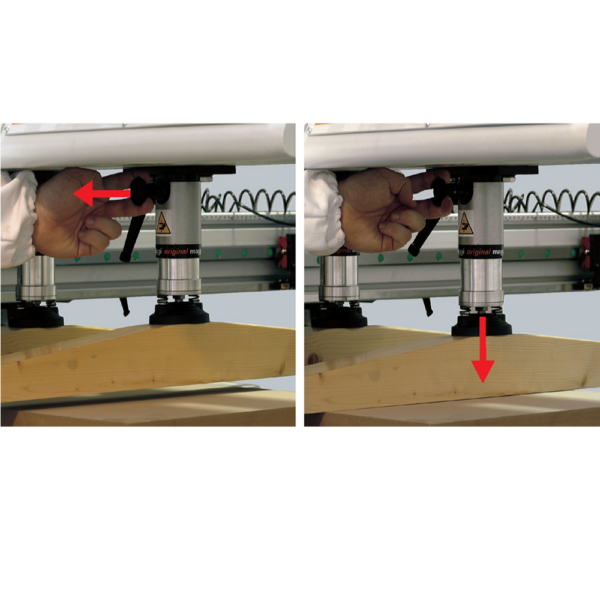 • Bezpieczeństwo – mocne, regulowane pneumatyczne dociski obrotowe 0°–90° pewnie trzymają płytę podczas wiercenia.