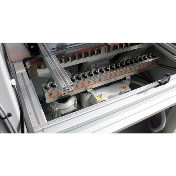 • Możliwość jednoczesnego wiercenia dwóch paneli – oś pośrednia 640 mm pozwala obrabiać jednocześnie dwa panele o szerokości 316 mm, co dramatycznie zwiększa produktywność.