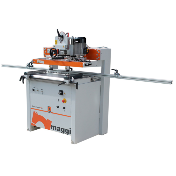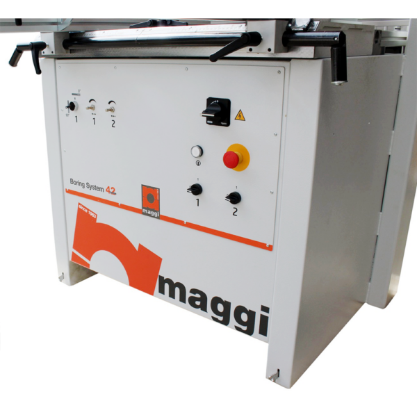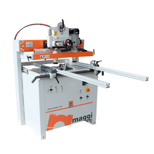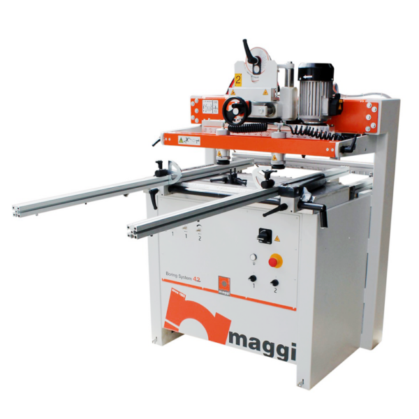 Maggi Boring System 42 to zaawansowana półautomatyczna wiertarka dwugłowicowa, łącząca głowicę pionową z uchylną głowicą poziomą (0°–90°). Dzięki temu rozwiązaniu pozwala na bardzo szybkie i precyzyjne wiercenie jednocześnie w płaszczyźnie pionowej i poziomej – idealne do produkcji korpusów szaf, regałów i mebli na wymiar.