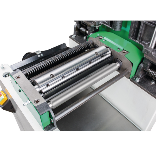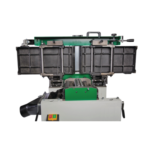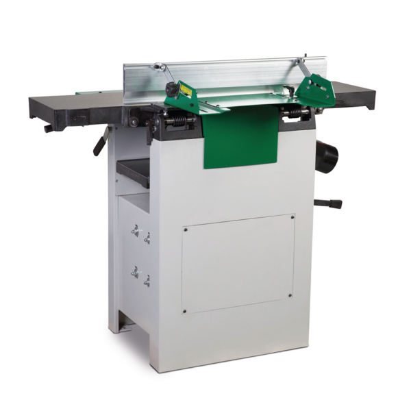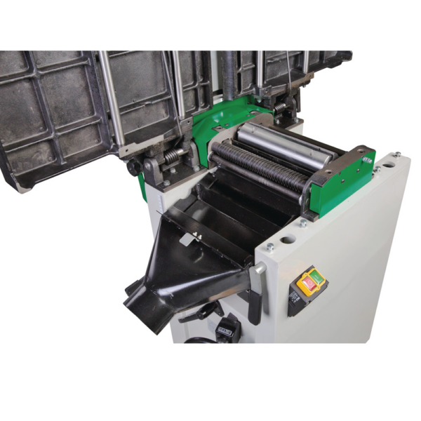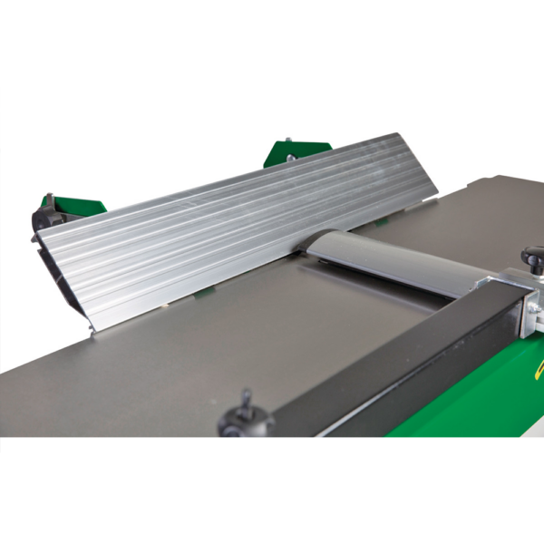 Automatyczny posuw z dwoma wałkami (stalowy, rowkowany wałek przedni + gumowany wałek tylny) zapewnia równomierne wciąganie materiału i doskonałą jakość powierzchni bez jej uszkadzania. Aluminiowa przykładnica regulowana w zakresie 90° – +45° pozwala na wygodne struganie kątowe. Stoły wyrówniarki podnoszone jednocześnie ułatwiają szybką zmianę między trybem wyrówniarki a grubiarki.
